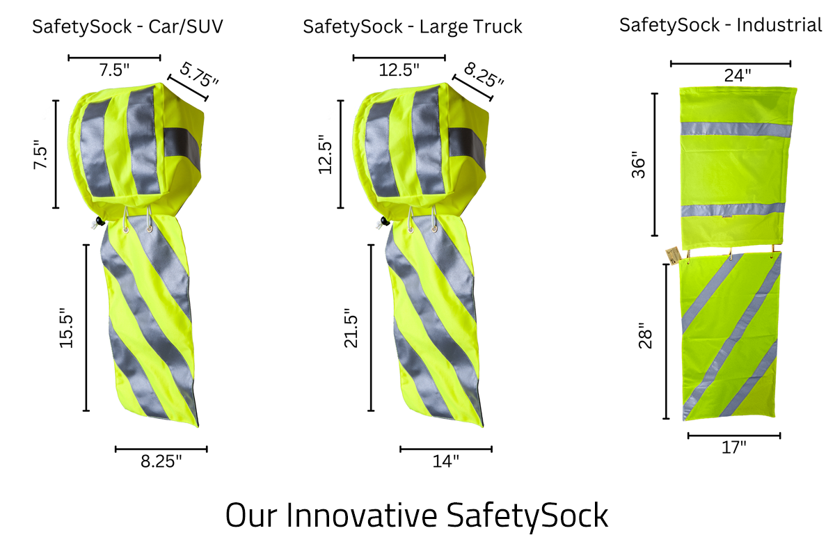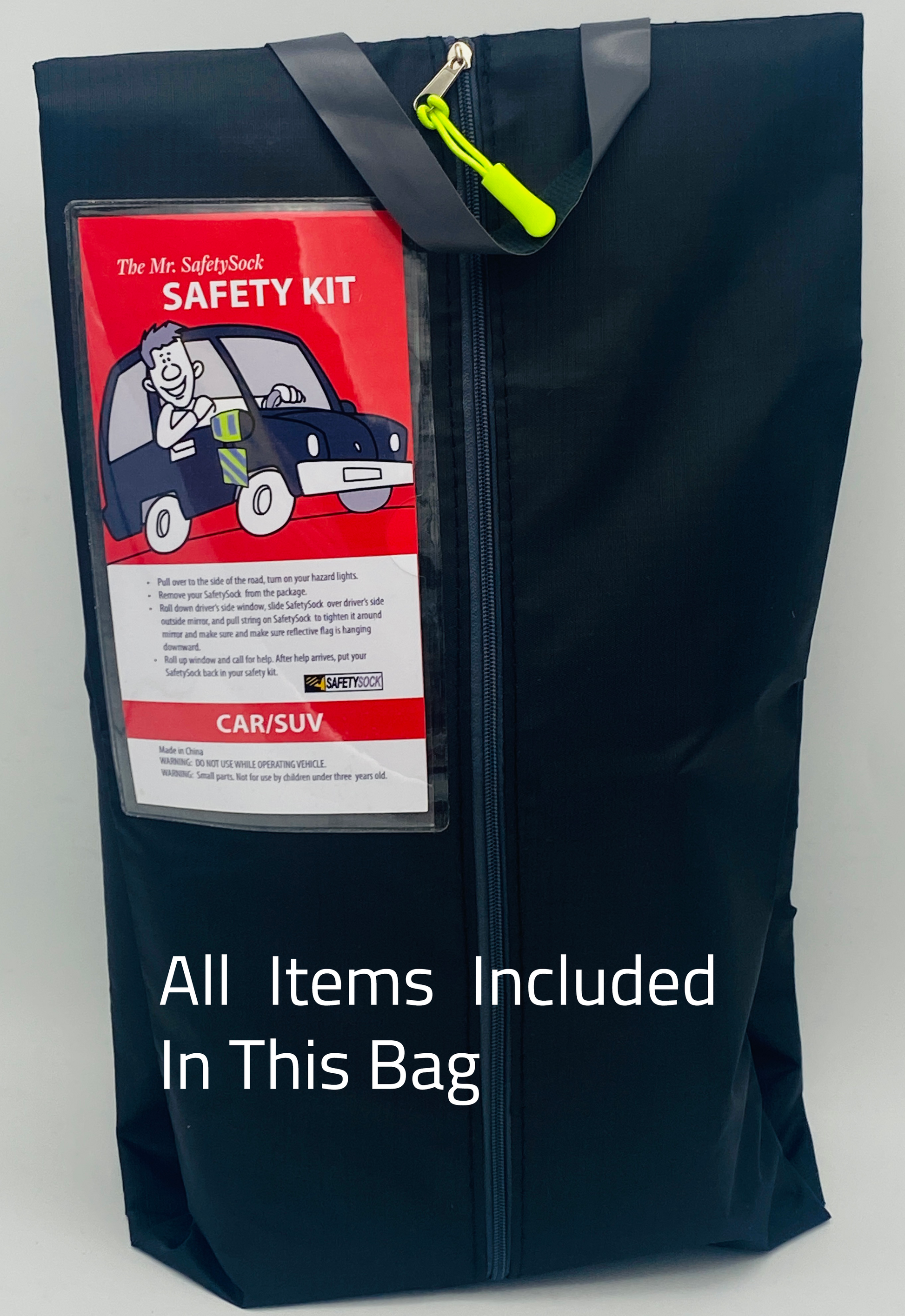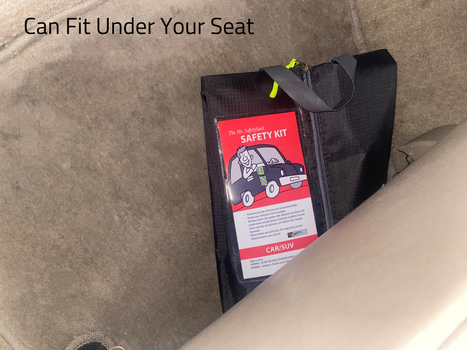 The Mr. SafetySock Safety Kit is designed to keep you safely in your vehicle during an emergency. Simply slide your kit under your seat and pull it out if you have an emergency.